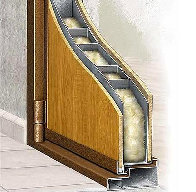 - от наполнения дверного полотна. Оно может быть наполнено гофрокартоном (т.н. сотовое заполнение) – это недорогой вариант, но такая изоляция слаба. Намного лучше изолирует заполнение минеральной ватой или пенополиуретаном