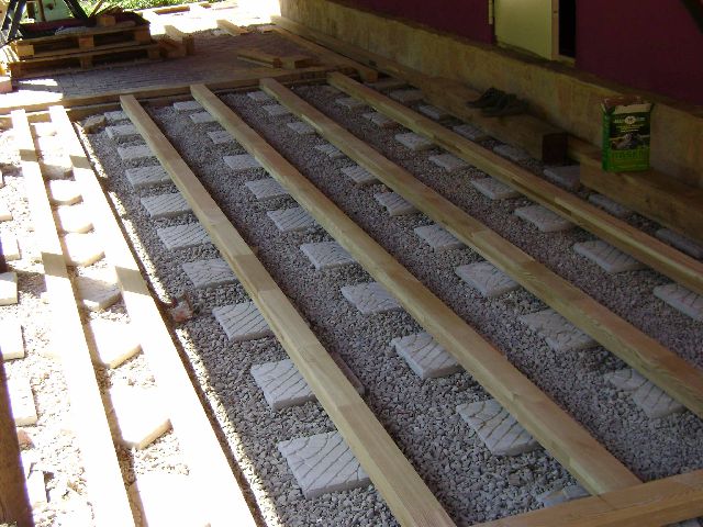 Деревянные лаги пропитывают антисептиком, либо используют импрегнированную древесину. При установке лаг следите, чтобы они не соприкасались с открытым грунтом. Соблюдайте правильный интервал между лагами. Лаги устанавливают перпендикулярно направлению досок и параллельно друг другу на расстоянии 40-50 см.