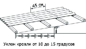 ![]() | 2. При угле наклона крыши от 10° до 15° (уклон от 1/6 до 1/4) делается обрешетка с интервалом 450 мм по осям. Концевой нахлест: 200 мм Боковой нахлест: 1 волна. |
