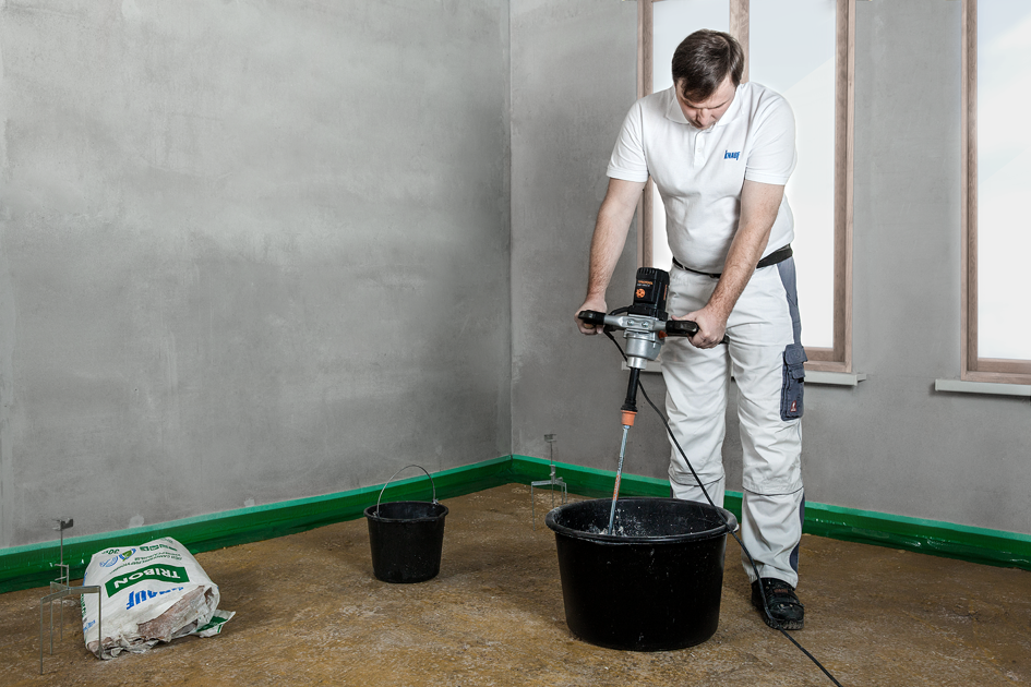 Заливка – самый занимательный и динамичный процесс при устройстве стяжки. К нему смело можно привлечь друзей – так процесс пойдет не только веселее, но и быстрее. Не забудьте про резиновые сапоги – они понадобятся для передвижения по заливаемым полам. Площадь заливки нужно планировать таким образом, чтобы успеть нанести и разравнять смесь в течение одного часа. Увеличение количества участников заливки и инструмента для перемешивания и разравнивания стяжки КНАУФ-Трибон приведёт к желаемому результату – ровному полу - быстро и качественно. КНАУФ-Трибон можно замешивать по два мешка одновременно, при этом количество воды увеличивается пропорционально, что значительно ускоряет процесс. Заливку следует вести от дальнего угла помещения, постепенно продвигаясь к выходу. Заливку прекращают по достижении обозначенной отметки пола, после чего разравнивают смесь с помощью рейки или щётки с жёсткой щетиной. Такая обработка позволит выгнать пузырьки воздуха из стяжки, тем самым уплотнив её, и окончательно разровнять поверхность нового пола. Все готово! Остаётся вымыть инструмент и дождаться схватывания стяжки.