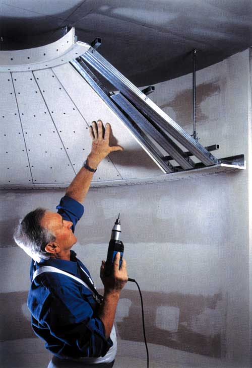Для формирования изогнутых конструкций, перегородок можно применять гипсокартон. С его помощью можно соорудить арки, ниши. Ширина листа гипсокартона одинакова почти у всех производителей. Но по длине листы бывают разными. Если лист гипсокартона увлажнить, то он становится более пластичным, может принимать определенную форму, которая сохраняется при высыхании материала.