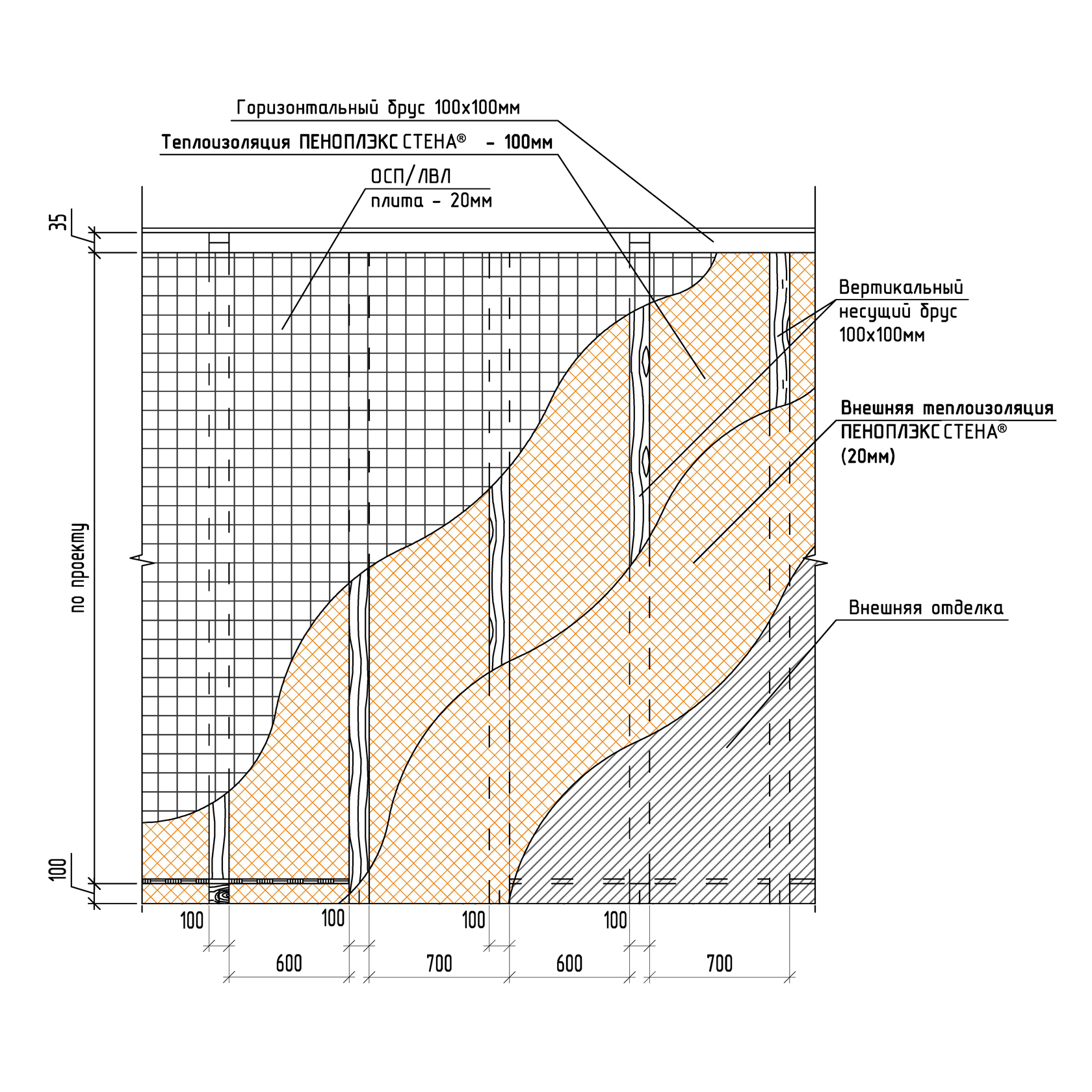 Жесткость стены обеспечивается краевыми и несущими балками, которые составляют единый несущий каркас, а пространство между балками заполняется утеплителем. Шаг несущих деревянных балок выбирается согласно расчету по нагрузкам, под габариты теплоизоляционных плит ПЕНОПЛЭКС®: ширина 600мм, длина 1200мм.