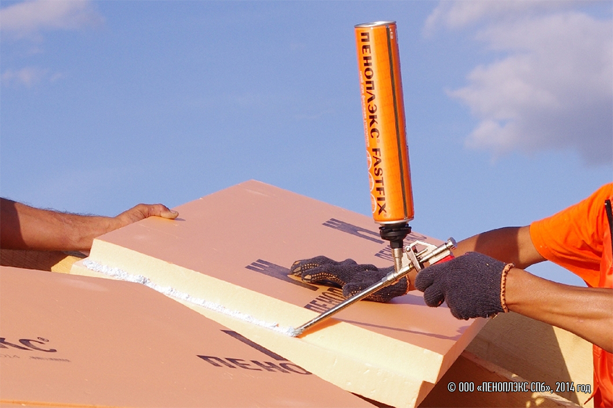 При наличии явных зазоров в конструкции между плитами ПЕНОПЛЭКС® и каркасом (либо для фиксации второго слоя плит ПЕНОПЛЭКС®) может применяться профессиональный полиуретановый клей ПЕНОПЛЭКС® FASTFIX®.