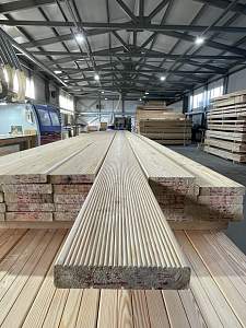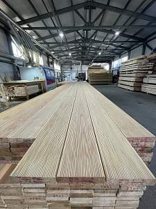 Кроме того, собственное производство позволяет производить эксклюзивные товары, например, комбинация террасной и палубной доски - эксклюзивная доска Дуэт. Для наших покупателей мы оказываем услуги распиловки и антисептирования погружным методом (окунанием). Наиболее популярные модели и размеры есть в наличии на нашем складе, кроме того мы производим пиломатериалы под заказ по индивидуальным размерам.