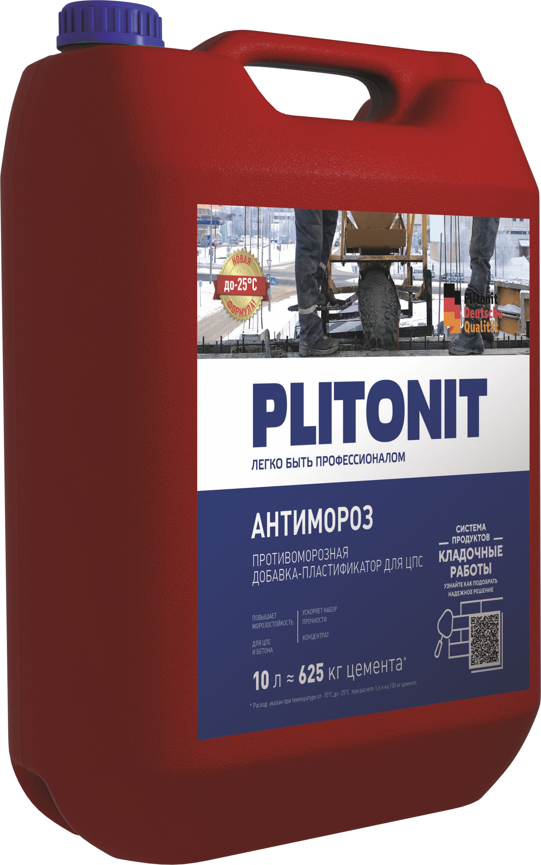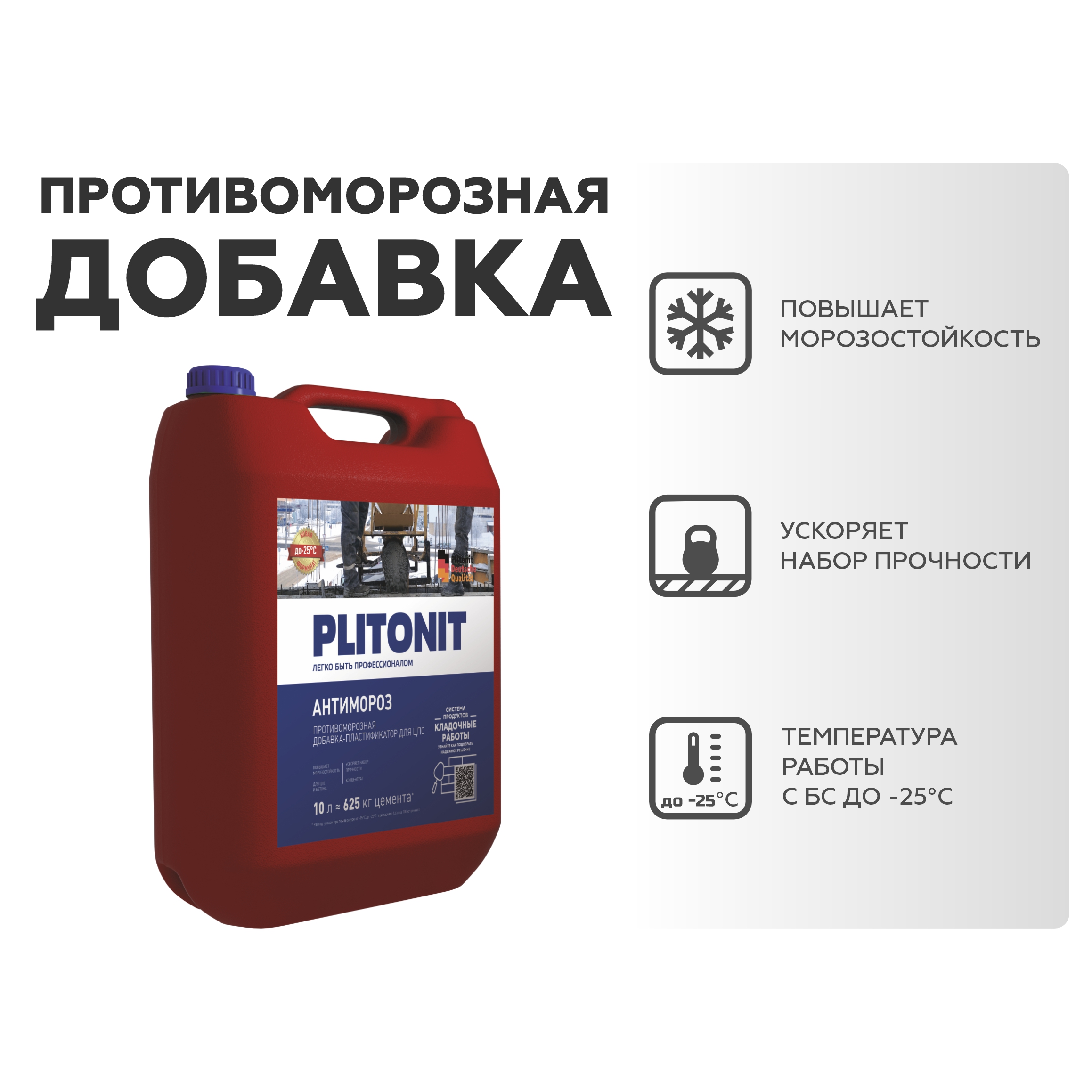 Плитонит Антимороз 10 л – специальная добавка для различных смесей Плитонит, используется для понижения температуры замерзания замерзания бетонов и цементных немодифицированных растворов, позволяя проводить работы при температурных условиях до -20 °С. Также, в условиях нормальной температура (около 20°C) смесь используется в качестве ускорителя твердения и набора прочности.