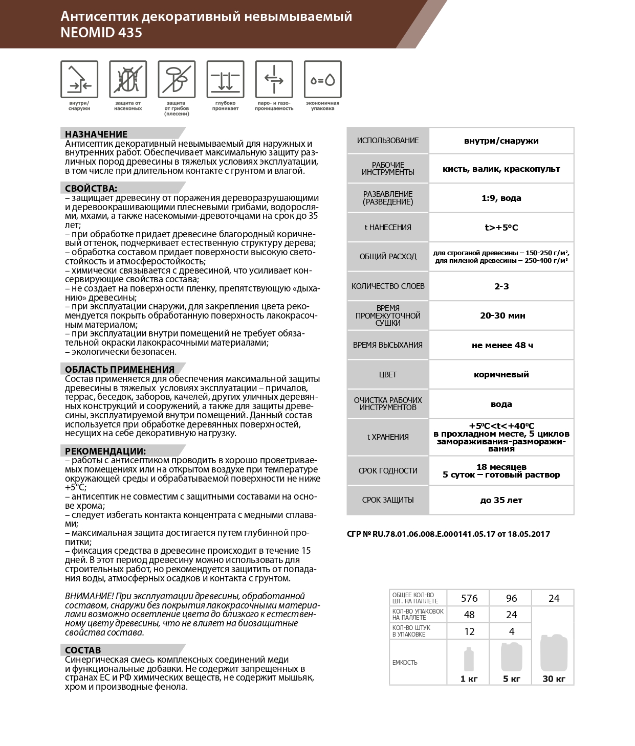 «NEOMID 435 Антисептик невымываемый» для наружных и внутренних работ, придает древесине благородный коричневый оттенок. Подчеркивает естественную структуру древесины.