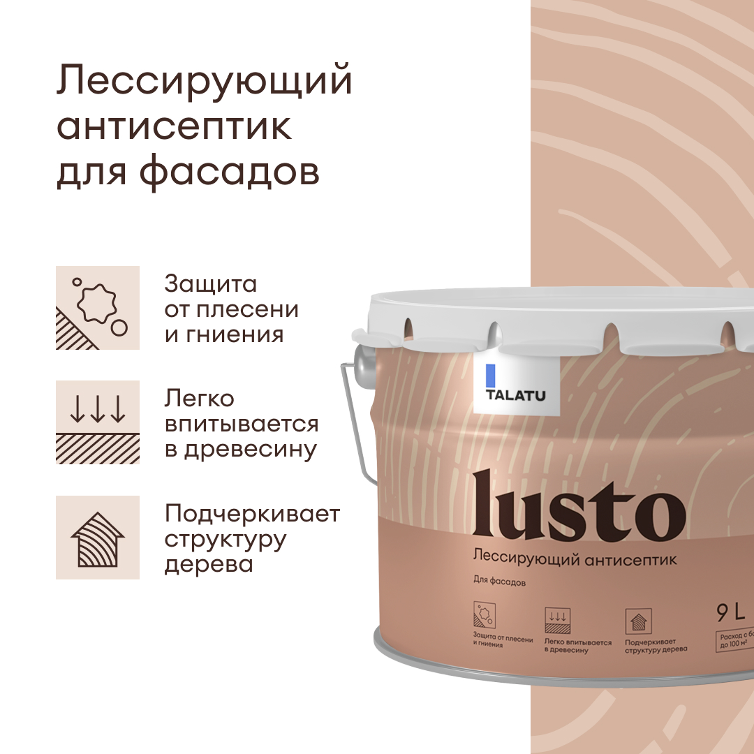 Лессирующая антисептирующая пропитка для фасадов Talatu Lusto предназначена для высококачественной защитно-декоративной отделки деревянных фасадов из всех видов обшивочных досок, срубов из бревна и бруса, а также других конструкций из дерева.