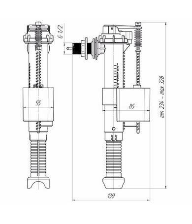 Набор для бачка унитаза. Наливной механизм с боковой подводкой и пластиковой резьбой диаметром 1/2. Сливной механизм металлизированная кнопка с одним режимом слива эконом