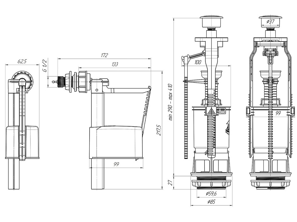 - Регулировка высоты механизма: 290-410 мм, что позволяет адаптировать под различные бачки;