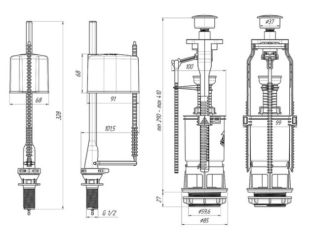 - Регулировка высоты сливного механизма: 290-410 мм;
