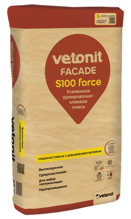 Vetonit facade S100 force - усиленная армировочно-клеевая смесь для монтажа теплоизоляции и создания базового штукатурного армированного слоя в СФТК. Содержит в себе микроволокно, обладает высокой прочностью более 10 Мпа и адгезией не менее 1.1 Мпа, обеспечивая прочность монтажа фасада. А благодаря высоким прочностным характеристикам и пластичности, смесь будет удобна для работы даже новичку. Увеличенное открытое время работы с материалом 20 минут! Идеально подходит для фасадов из-за высокой паропроницаемости. Продукт доступен в морозостойкой версии для работ до -10 °C окружающей среды и основания.