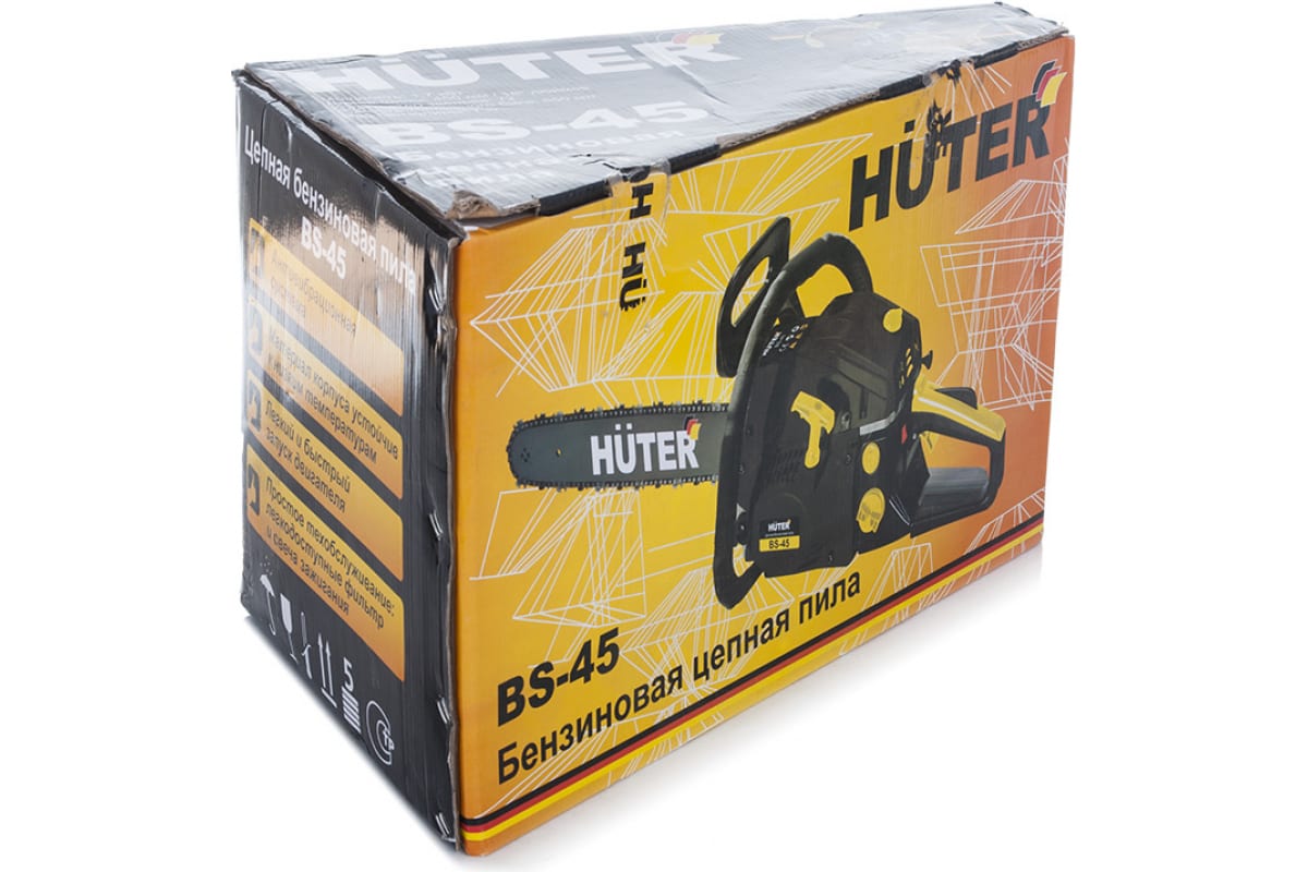Бензопила HUTER BS-45 – легкий и надежный инструмент для дачи и небольшого загородного строительства. Пила укомплектована двигателем на 2,3 л.с. и 45 сантиметровой шиной для заготовки дров и подрезки небольших деревьев. Автоматический тормоз цепи и щиток для рук обеспечивают безопасность. Воздушный фильтр защищен специальным кожухом, который легко открывается с помощью специального поворотного колесика. Рукоятка бензопилы Huter BS-45 имеет удобную для захвата форму. Расширенная нижняя часть рукоятки - для защиты руки при разрыве цепи. Объем бака в 0,55 литра хватает на долгую работу без дозаправки. В полной комплектации пила весит 7 кг.