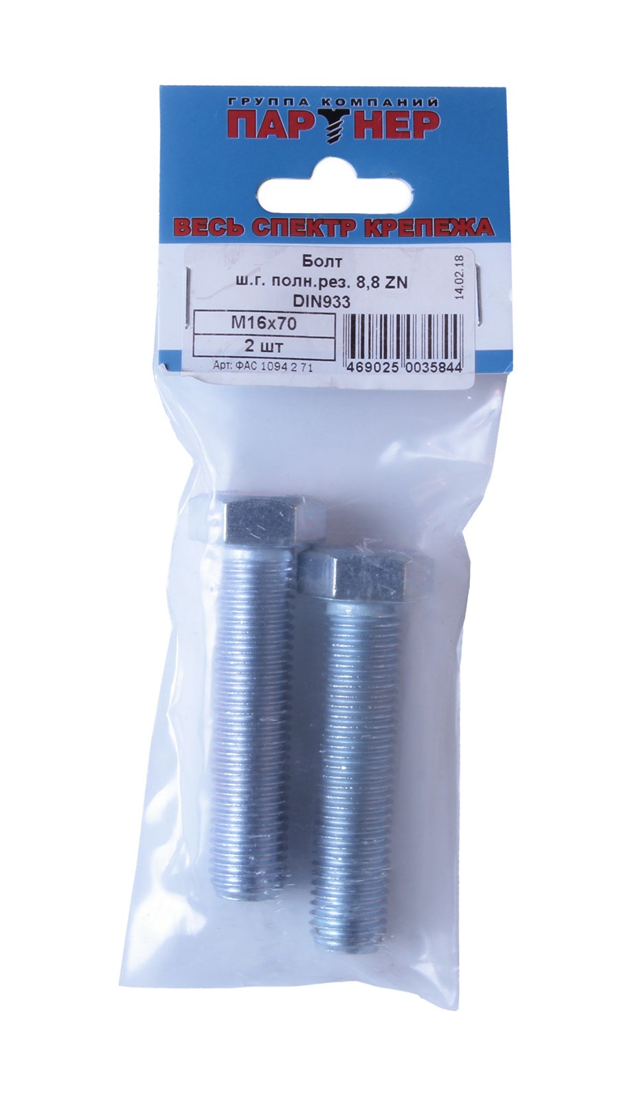 Болты оцинкованные 16 х 70 с полной резьбой DIN933 2шт/упак