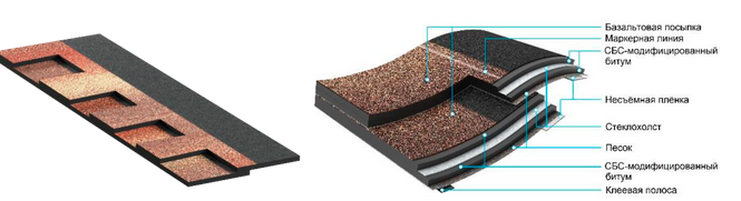 Верхняя поверхность черепицы покрыта окрашенным базальтовым гранулятом, а нижняя - посыпкой из мелкозернистого песка.пленкой и клееевой полосой.
