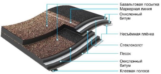 Верхняя поверхность черепицы покрыта окрашенным миксом гранулятов - базальт и антрацит, а нижняя - посыпкой из мелкозернистого песка.пленкой и клееевой полосой.