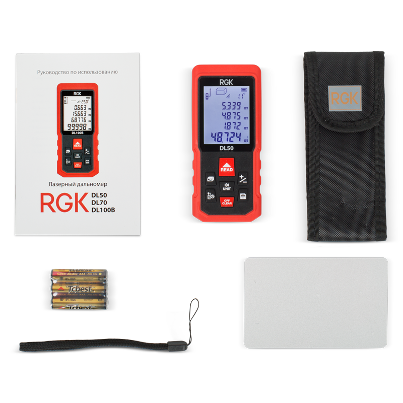 Питание лазерного дальномера RGK DL50 осуществляется от трех батареек типа ААА или аккумуляторов аналогичного формата. Одного комплекта батарей хватает для 8000 измерений. Для экономии заряда лазер и подсветка экрана автоматически отключаются через 20 секунд, а сам прибор - через 2,5 минуты.