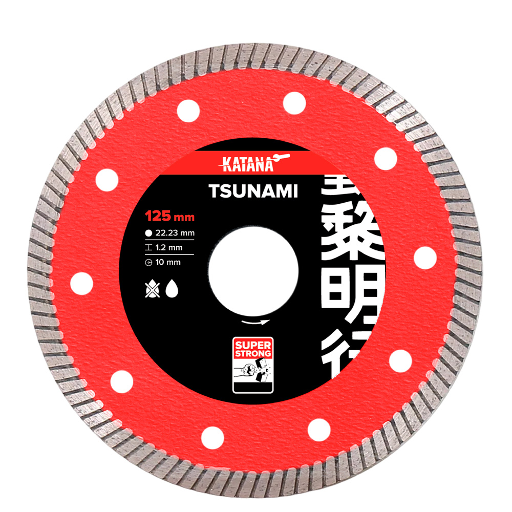 Отрезной диск KATANA TSUNAMI 125 мм с волнообразной рабочей поверхностью обеспечивает тонкий рез без сколов даже при работе с самыми прочными материалами. Турбированные пазы алмазоносного слоя эффективно врезаются в материал, охлаждая зону резки. Диск эффективно режет даже самый толстый керамогранит. Диск изготовлен по технологии горячего прессования, что обеспечивает увеличенный ресурс работы.