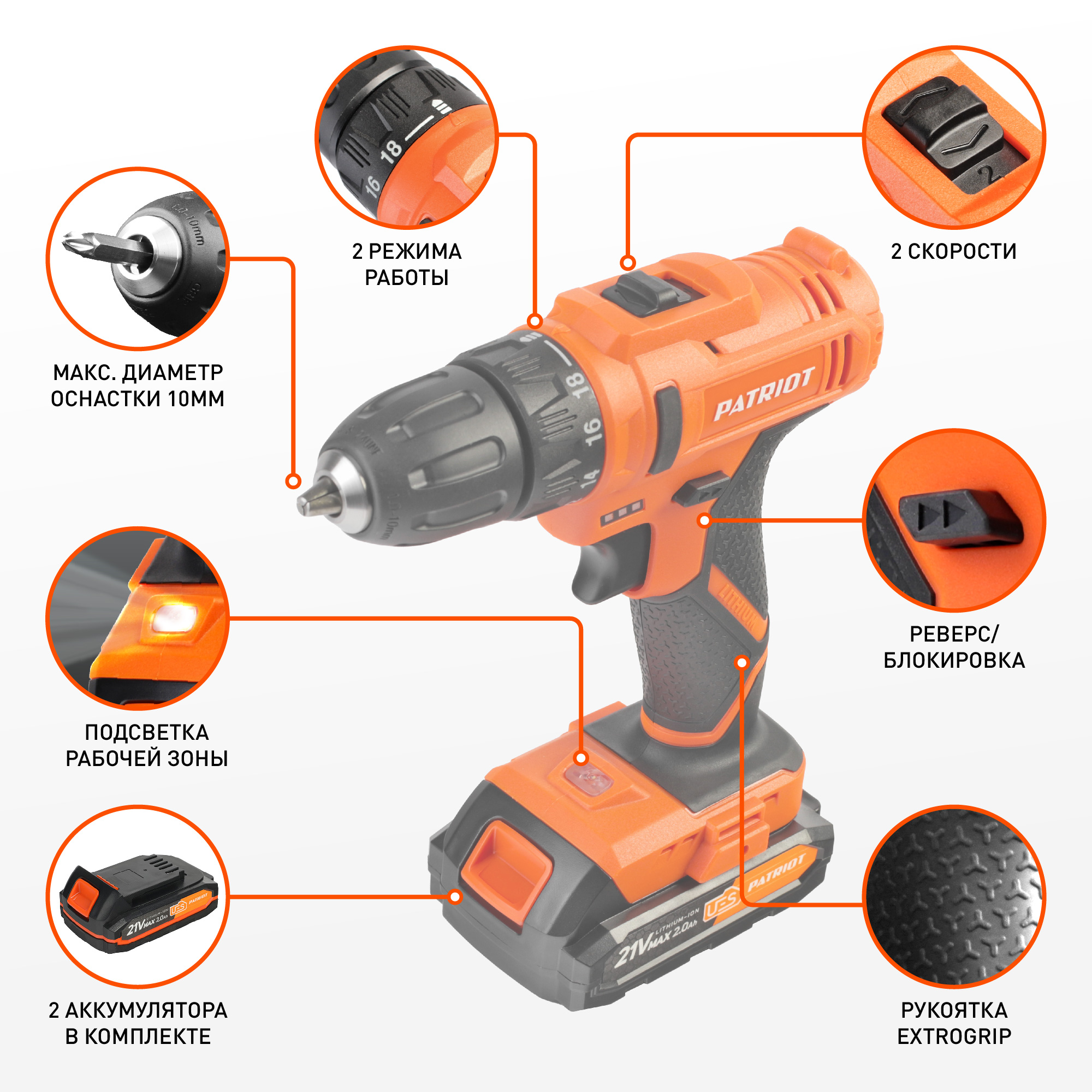 Аккумуляторная дрель-шуруповёрт PATRIOT 18В Li - ion BR 189 UES — компактный и эргономичный инструмент, применяемый для сверления отверстий и монтажа крепежа. Применим во всех сферах: от проведения ремонтно-строительных работ до мелкого бытового ремонта. Модель имеет двухскоростной редуктор, что позволяет эффективно работать с крепежом и сверлами. Оснащена регулировкой крутящего момента на 18 позицию и режимом сверления. Дополнительное удобство в работе обеспечено индикатором уровня заряда и подсветкой рабочей зоны, а также эргономичной прорезиненной рукояткой. Есть функция реверса. Есть плавный пуск. Предусмотрена защита от перегрузок.