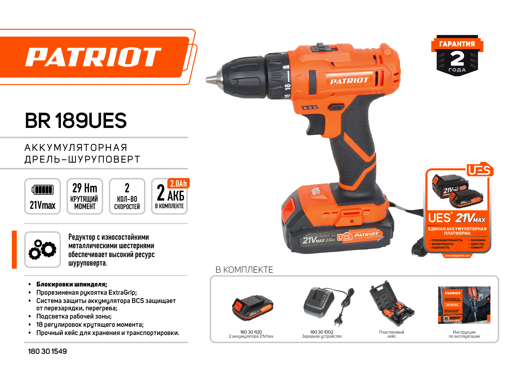 Дрель - шуруповерт аккумуляторная PATRIOT 21В Li - ion BR 189 UES
