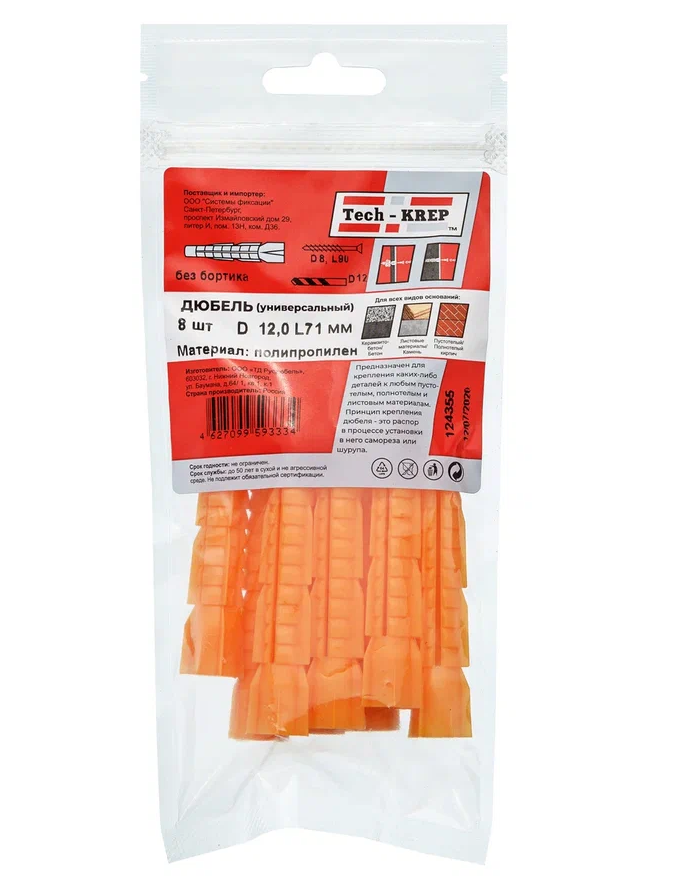 Универсальный дюбель применяется для закрепления и монтажа различных деталей и изделий в различные типы сплошных и пустотелых оснований. Изготовлен из полипропилена. Дюбель при закреплении в полнотелом материале (бетон, кирпич, природный камень) разжимается и входит в плотный контакт со стенками отверстия. При монтаже в пористые, пустотелые материалы (ячеистый бетон, пустотелый кирпич) и листовые материалы изделие сворачивается, выпучивается и фиксируется в основании. Дюбель используется совместно с универсальными саморезами. Устанавливается в предварительно просверленное отверстие.