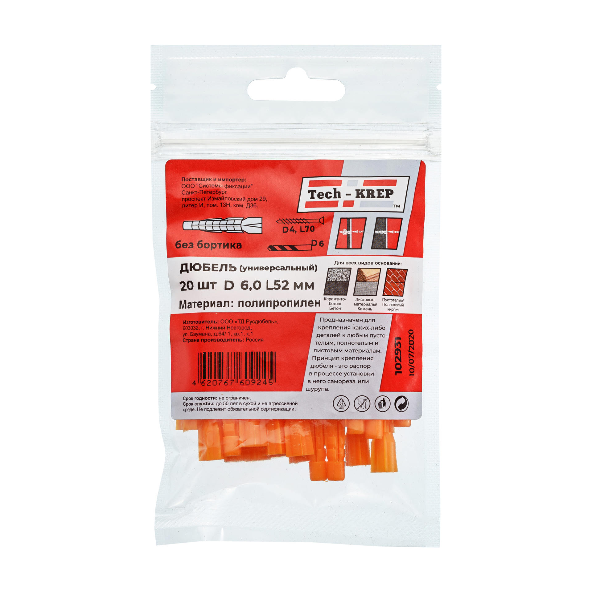 Универсальный дюбель применяется для закрепления и монтажа различных деталей и изделий в различные типы сплошных и пустотелых оснований. Изготовлен из полипропилена. Дюбель при закреплении в полнотелом материале (бетон, кирпич, природный камень) разжимается и входит в плотный контакт со стенками отверстия. При монтаже в пористые, пустотелые материалы (ячеистый бетон, пустотелый кирпич) и листовые материалы изделие сворачивается, выпучивается и фиксируется в основании. Дюбель используется совместно с универсальными саморезами. Устанавливается в предварительно просверленное отверстие.