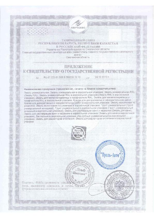 • Эмаль наносится с расстояния 25–30 см в 2-3 слоя с промежуточной сушкой 10–15 минут при температуре +20°С. Время сушки «на отлип» при температуре +20°С не менее 40 минут. Время полного высыхания при температуре +20°С не менее 5 часов.