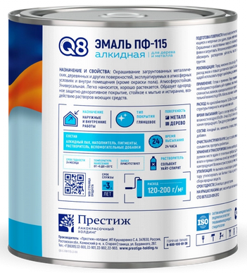 Эмаль ПФ-115 Formula Q8 предназначена для окраски загрунтованных металлических, деревянных и других поверхностей, подвергающихся атмосферным воздействиям и для окраски внутри помещений (кроме окраски пола). После высыхания образует однородное, гладкое декоративное покрытие, стойкое к мытью и истиранию, воздействию воды, растворов моющих средств.