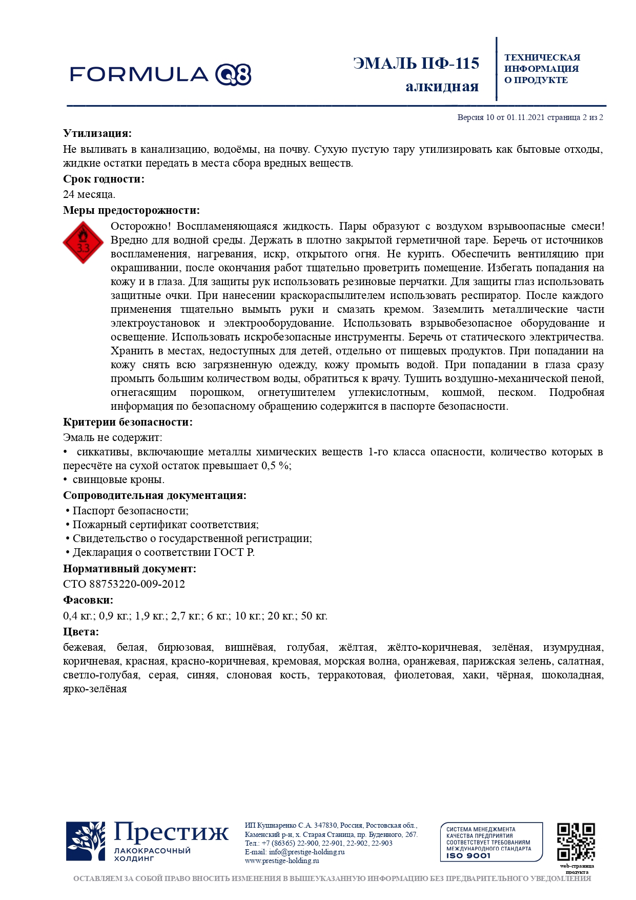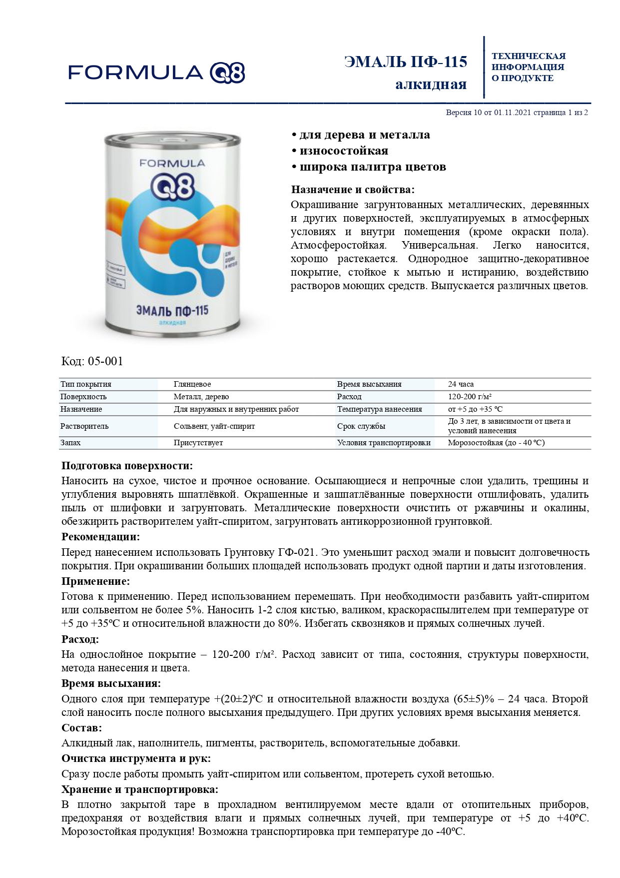 Эмаль ПФ-115 Formula Q8 предназначена для окраски загрунтованных металлических, деревянных и других поверхностей, подвергающихся атмосферным воздействиям и для окраски внутри помещений (кроме окраски пола). После высыхания образует однородное, гладкое декоративное покрытие, стойкое к мытью и истиранию, воздействию воды, растворов моющих средств.
