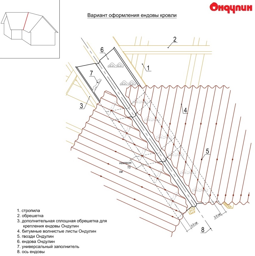 - Нахлест элементов ендовы при монтаже составляет 15см