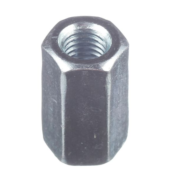 Гайка соединительная оцинкованная DIN6334 – специальный крепеж для надежного соединения двух резьбовых стержней или удлинения резьбовых соединений там, где требуется максимальная прочность и площадь контакта резьбы.