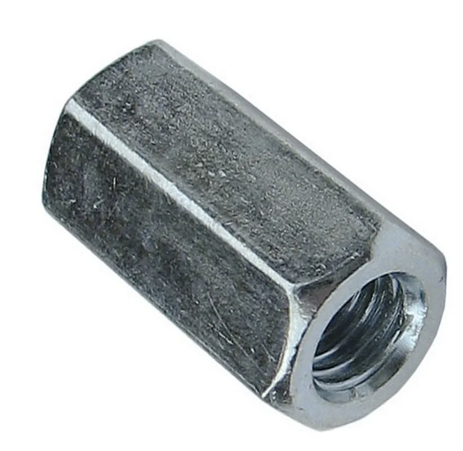 Гайка соединительная оцинкованная DIN6334 – специальный крепеж для надежного соединения двух резьбовых стержней или удлинения резьбовых соединений там, где требуется максимальная прочность и площадь контакта резьбы.
