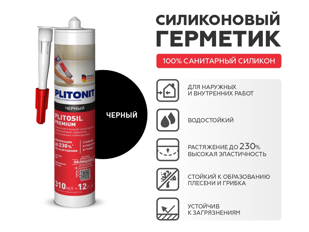 PLITOSIL Premium - высокоэластичный силиконовый санитарный герметик кислотного отверждения для влажных помещений