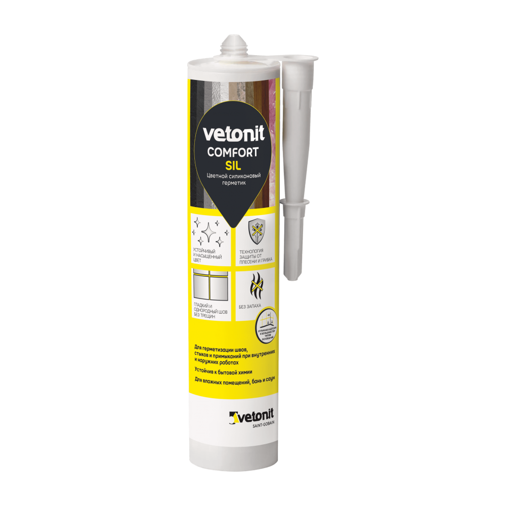 Vetonit comfort sil нужен для герметизации угловых стыков плиточных облицовок (стена-стена, стена-пол), стыков, примыкающих к санитарно-техническому оборудованию (ванны, раковины, унитазы и др.), а также стыков напольных покрытий (плитка-паркет и др.) в сухих и влажных помещениях: ванных комнатах, душевых, кухнях, туалетах, саунах, банях и т.д. У герметика отсутствует запах благодаря тому, что его состав сделан на основе нейтрального силикона, что позволяет использовать его во многих направлениях. Герметик представлен в 11 цветах. Герметик стойкий к ультра фиолетовому излучению, к бытовой химии, а также предотвращает появление плесени и грибка.