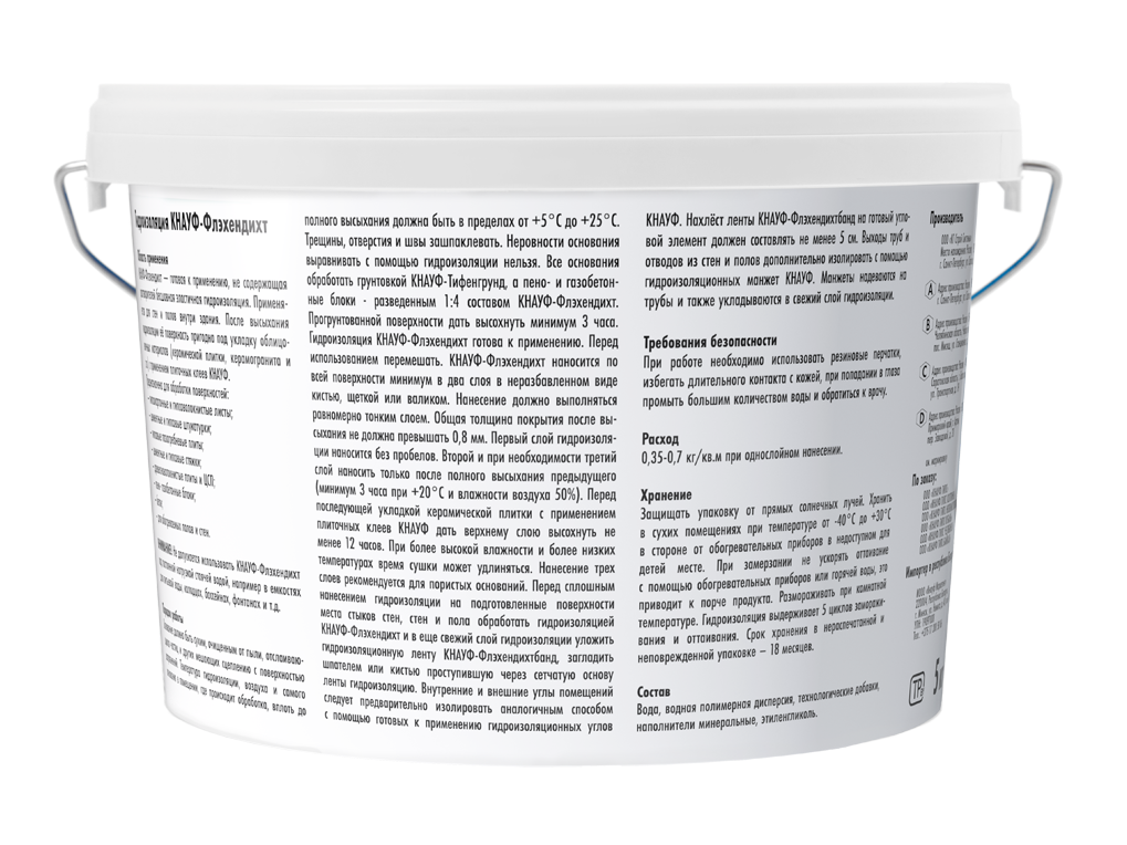КНАУФ-Флэхендихт представляет собой водную дисперсию синтетического латекса и инертных заполнителей, голубого цвета. Используется для гидроизоляции поверхностей стен и пола внутри зданий. Не содержит растворителей.