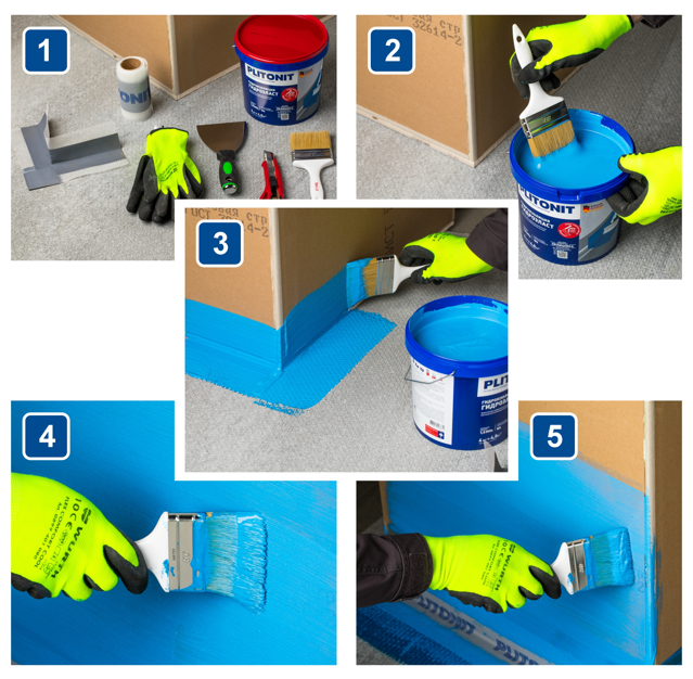 Мастику следует перемешать перед использованием. Затем наносить с помощью валика или шпателя на подготовленное основание в 2-3 слоя. Каждый следующий слой следует наносить после высыхания предыдущего, примерно через два-три часа. По мере того как мастика будет высыхать, цвет ее будет меняться с голубого на серый.