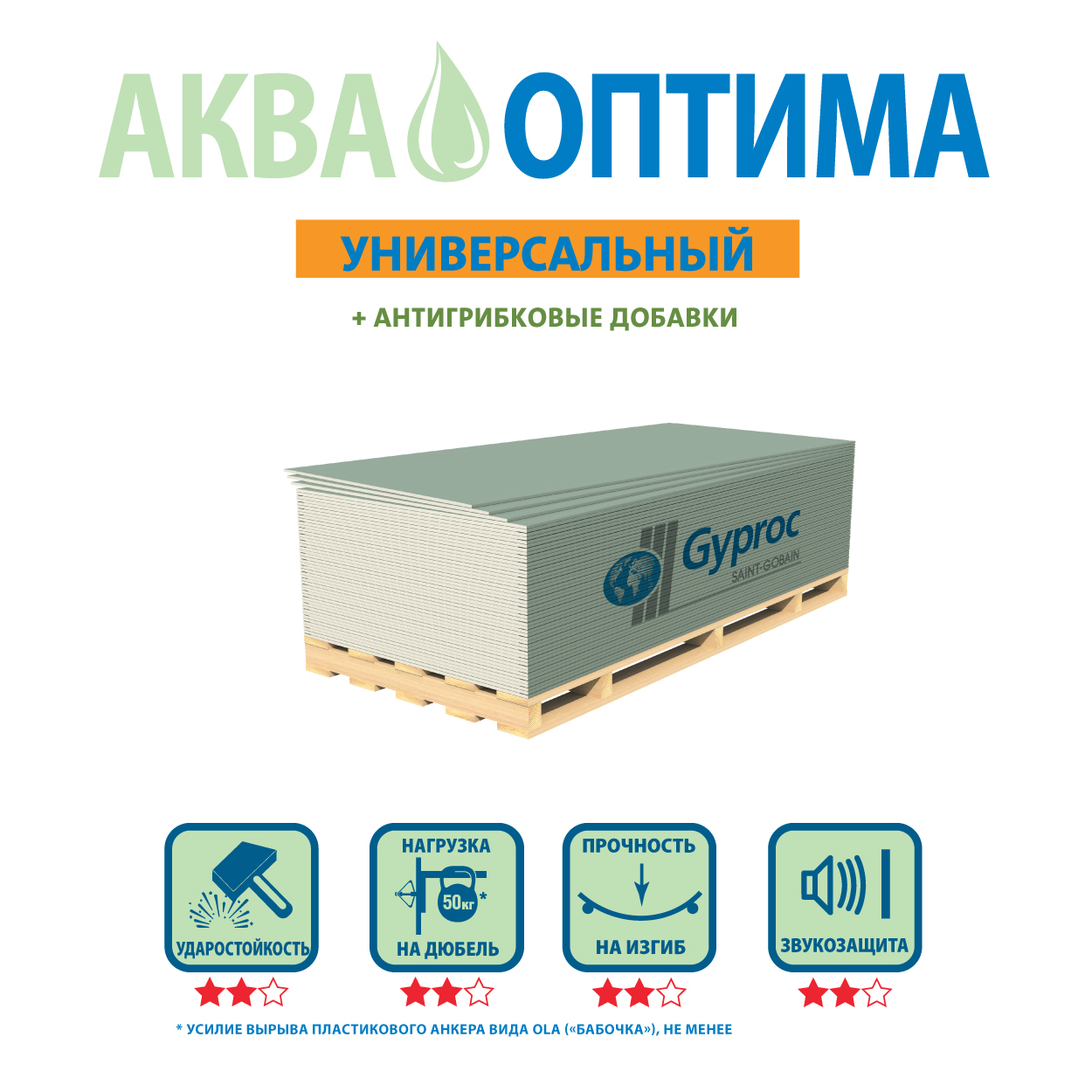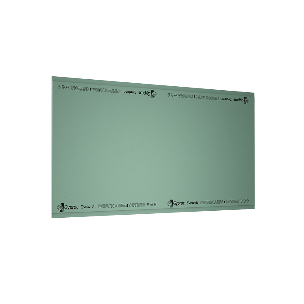 Гипсокартон влагостойкий Ветонит (Гипрок) Аква Оптима (ГСП-Н3) - универсальная гипсовая строительная плита (ГСП), которая подходит для монтажа любых конструкций в помещениях с высокой влажностью (санузел, ванная, кухня). Применение специальных добавок делают данный продукт долговечным и устойчивым к грибку.