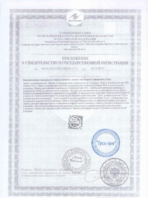 Состав: модифицированная алкидная смола, пигменты, наполнители, функциональные добавки, ксилол, метилацетат, пропан, бутан
