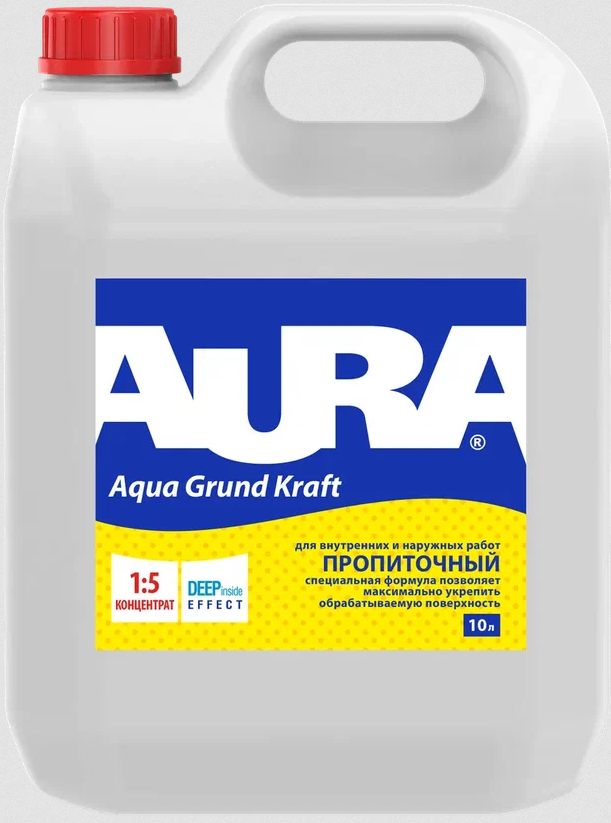 Искал грунт подешевле для обеспыливания стен, купил Aura Kraft, разбавил водой 1:5. С одной 10-литровой канистры концентрата получилось 60 литров готового грунта за совершенно смешные деньги. Свою задачу грунт выполнил.