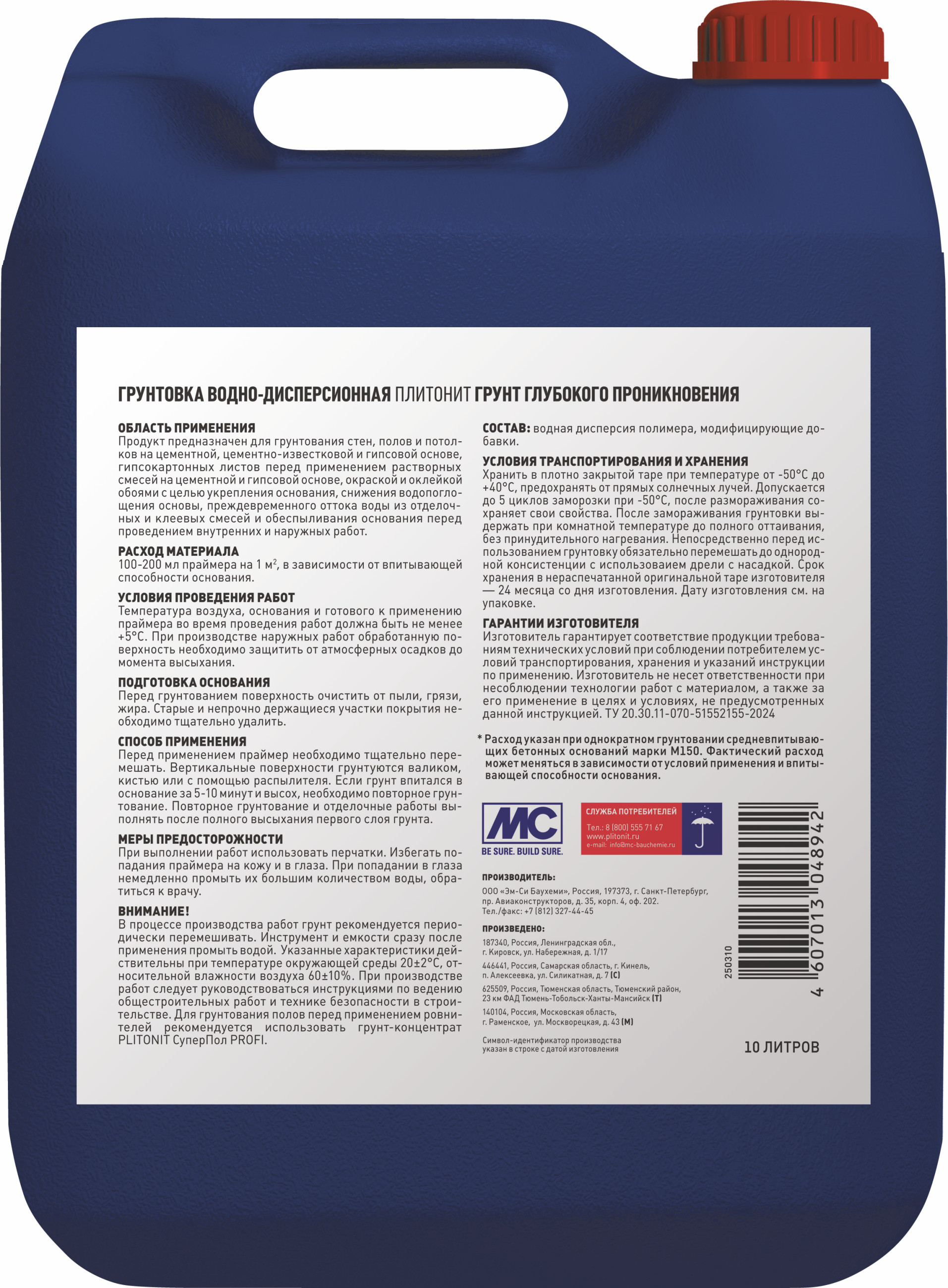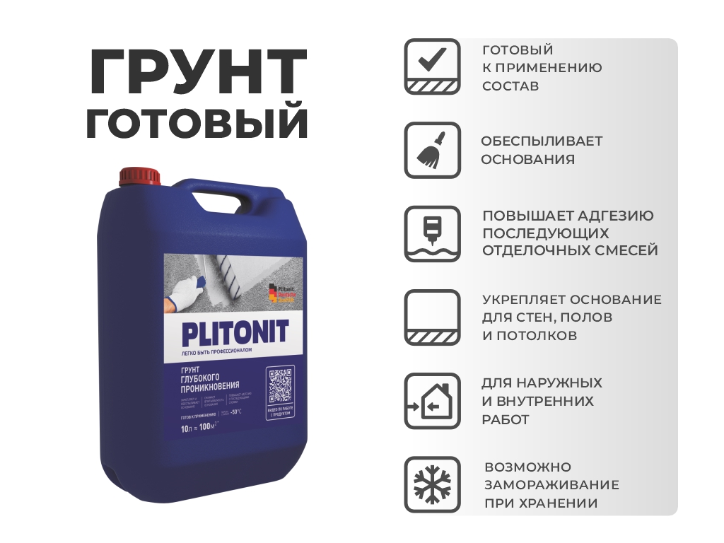 Грунт Плитонит глубокого проникновения 10л -Готовая к применению грунтовка глубокого проникновения для внутренних и наружных работ