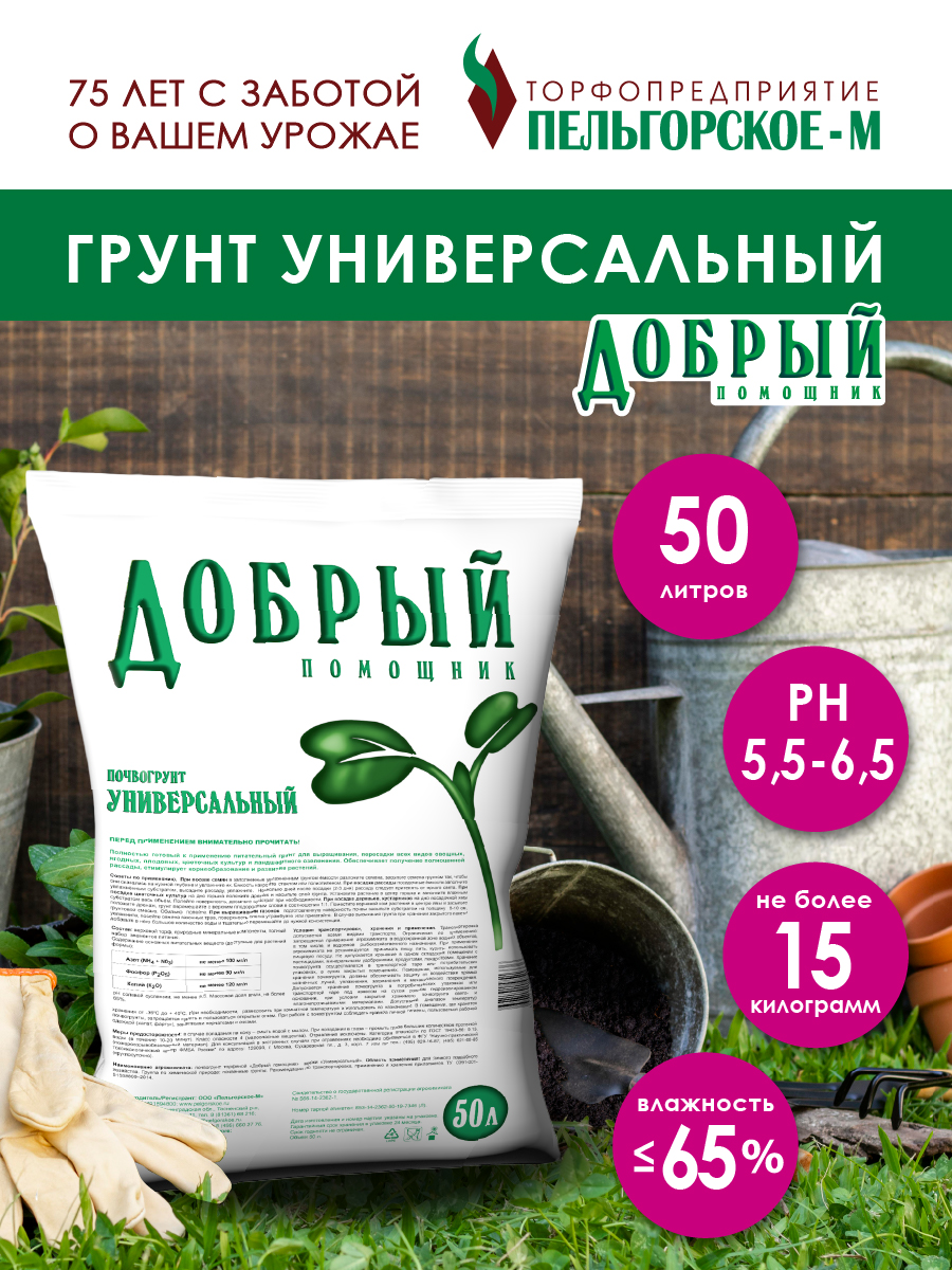 Добрый помощник - универсальный плодородный грунт, богатый минеральными и органическими компонентами.