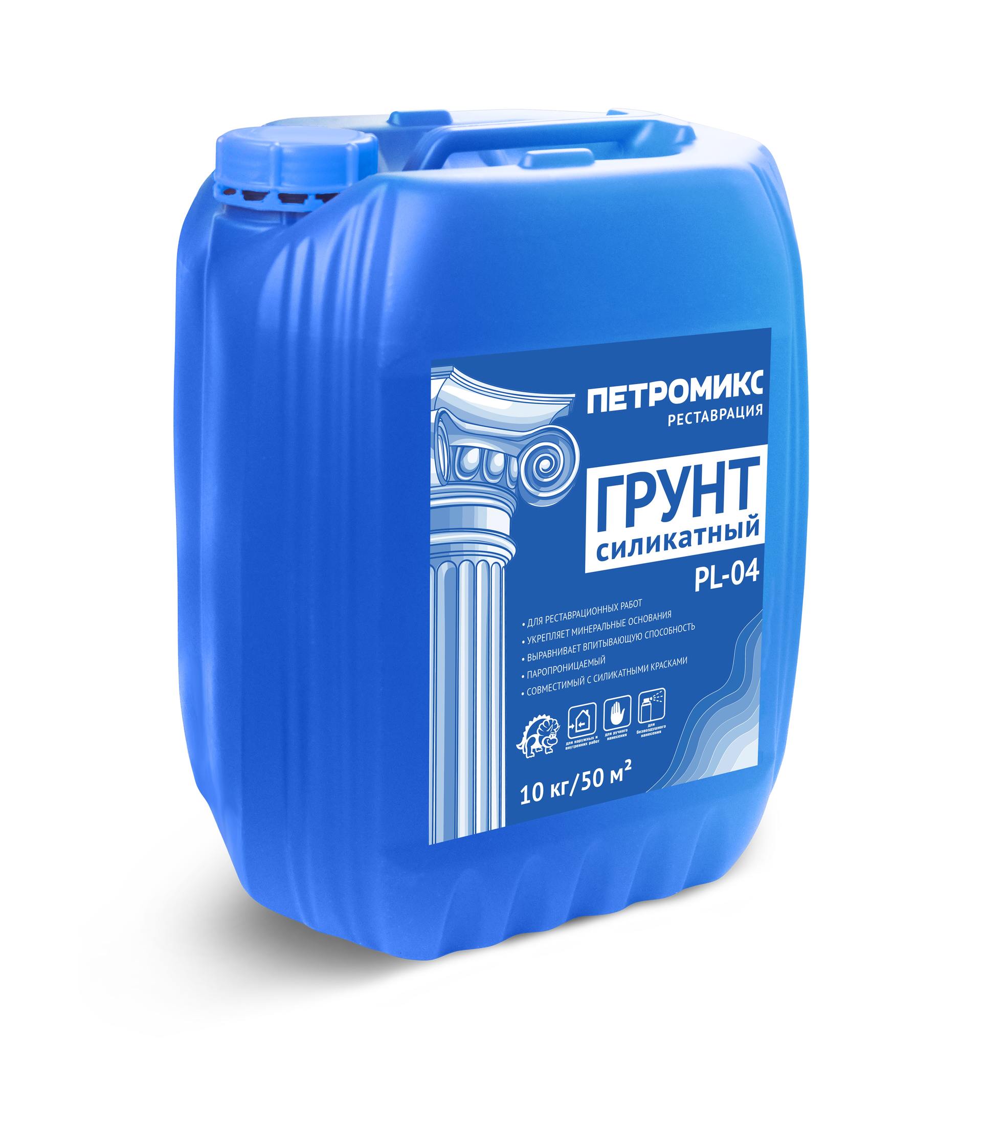 Грунт силикатный Петромикс PL-04 10 кг - готовый грунт для упрочнения слабых минеральных оснований, трещин, кромок и краев старой штукатурки перед дальнейшим восполнением утраченных отделочных слоев или окрашиванием. Паропроницаемый грунт, имеющий впитывающую способность. Предназанчен для внутренних и внешних работ.