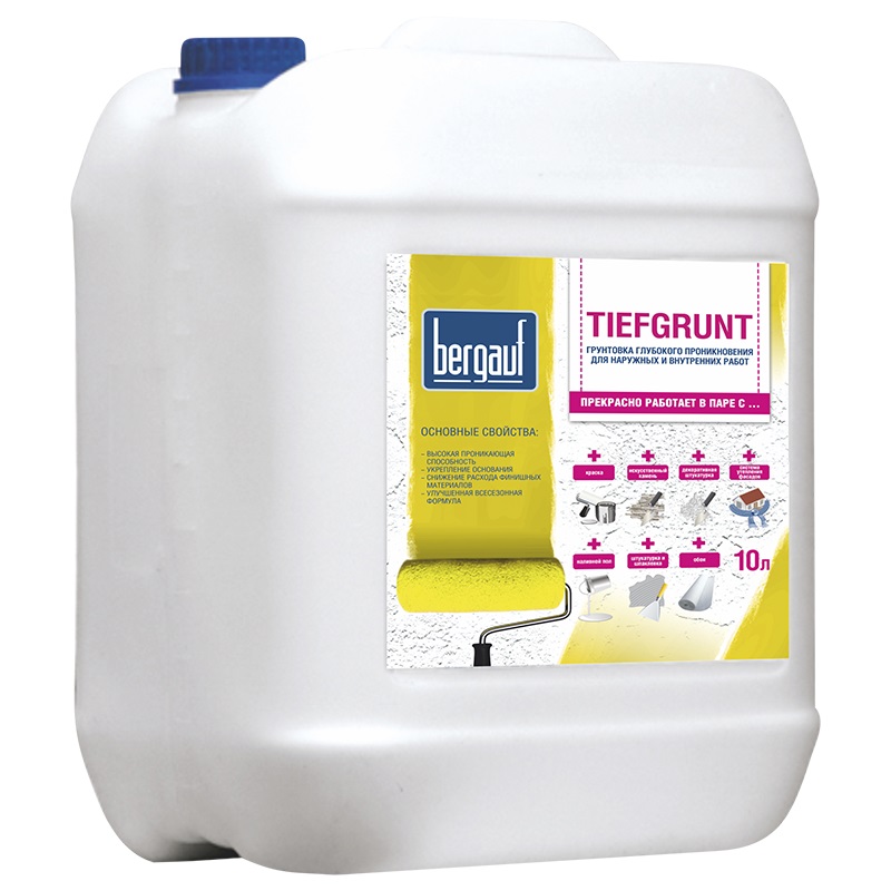 Грунтовка Bergauf Tiefgrunt готовая 10 л - готовая грунтовка, увеличивающая прочность поверхности и уменьшающая количество расходных финишных средств. Подходит для объектов с нормальным и повышенным уровнем влаги. Преимущества: -Высокая проникающая способность -Укрепление основания -Снижение расходов финишных материалов -Улучшенная всесезонная формула Расход грунтовки на 1 кв. м - 100-200 г Подготовка: Приготовление: