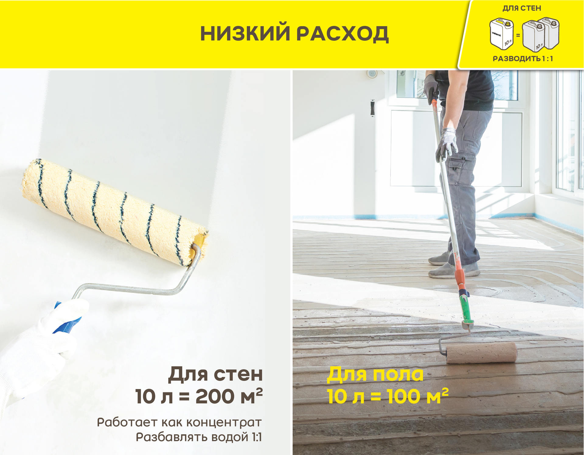 Подходит для предварительной подготовки оснований из бетона, ячеистого бетона, кирпича керамического и силикатного, ЦСП, ГКЛ, ГВЛ, штукатурки и шпаклевки, полов на комплексном и цементном вяжущем.