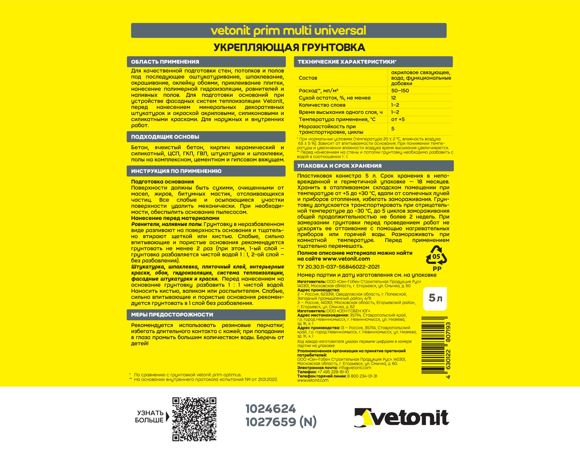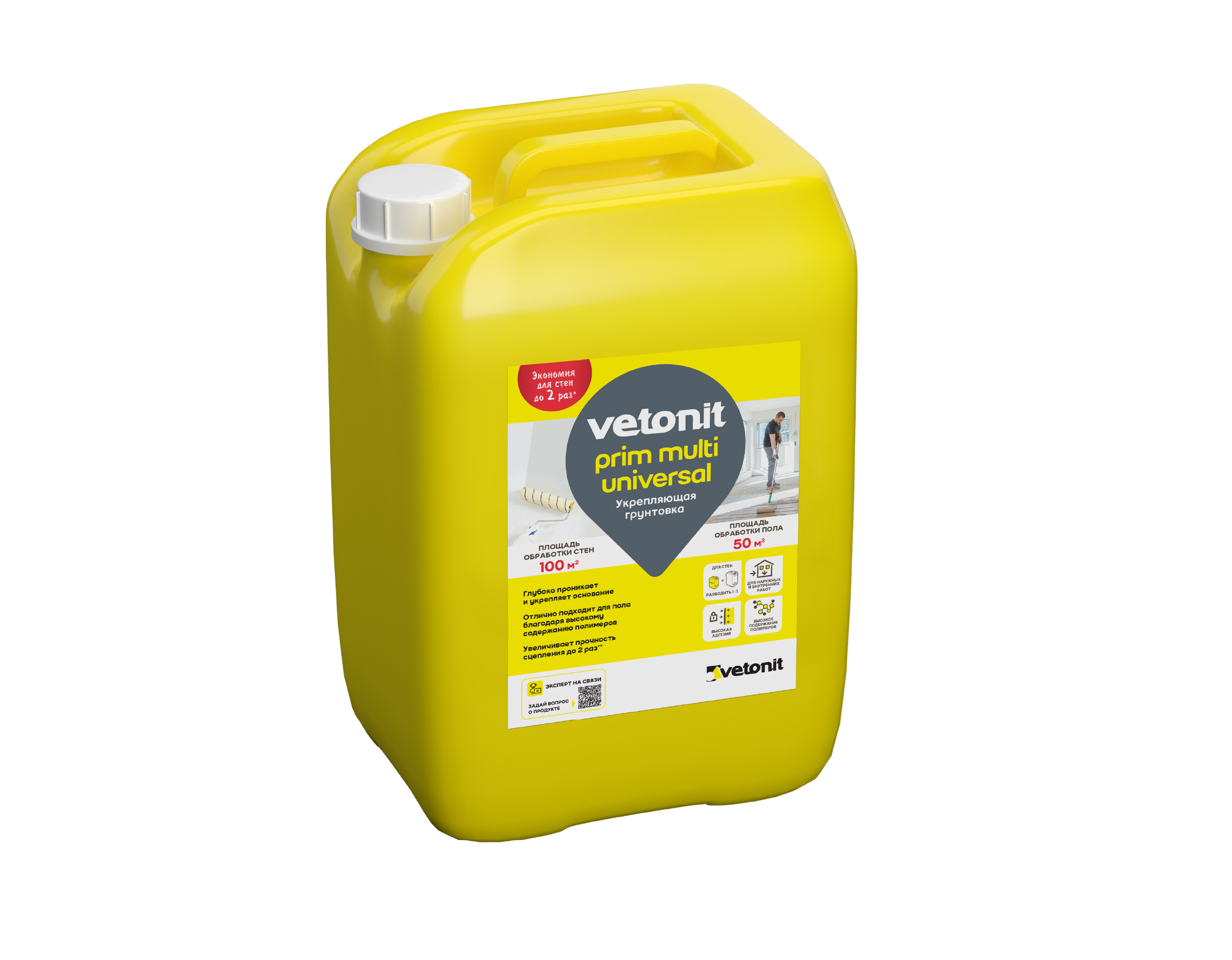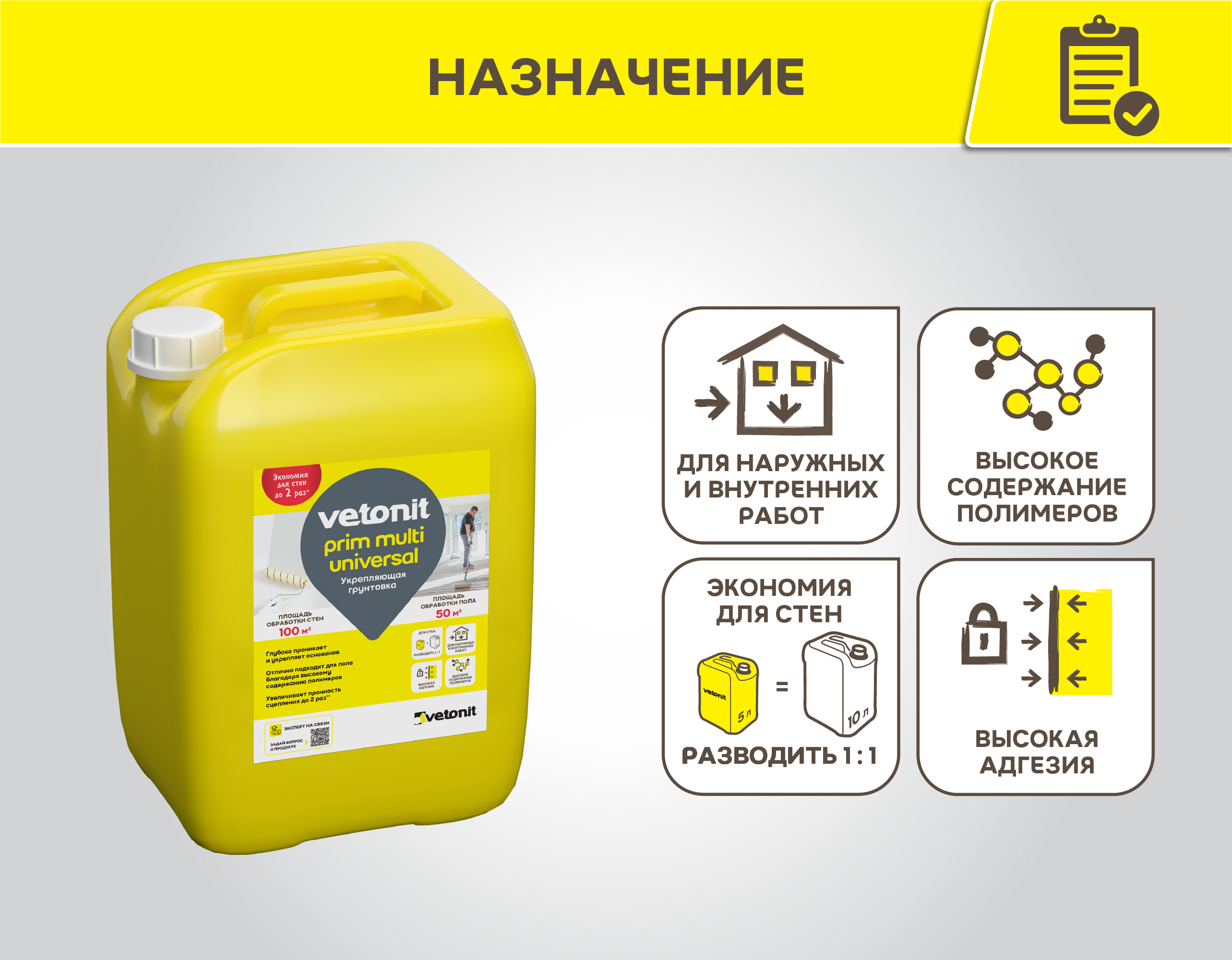 Грунтовка Ветонит Прим Мульти предназначена для качественной подготовки стен, потолков, полов под последующее оштукатуривание, шпаклевание, окрашивание, оклейку обоями, приклеивание плитки, нанесение полимерной гидроизоляции Вебер.тек 822, ровнителей и наливных полов.