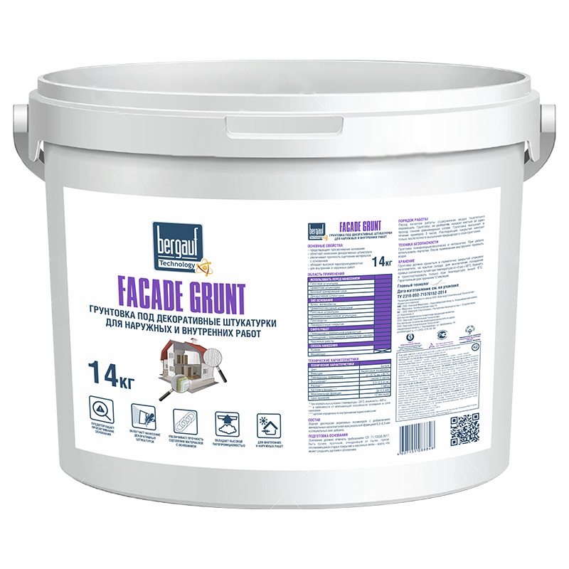 Грунтовка Bergauf Facade Grunt для наружных и внутренних работ 14кг - грунтовка под декоративные штукатурки для наружных и внутренних работ. Используется для увелечния сцепления финишных материалов с основанием, что обеспечивает высокое качество финишного покрытия.