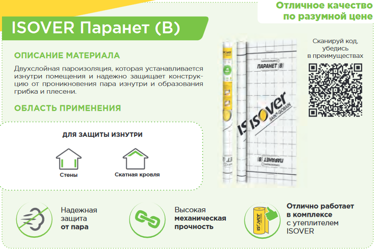 Изовер Паранет - это двухслойная пароизоляция. Применяется для пароизоляции изнутри помещения, надежно защищает конструкцию от проникновения пара, что препятствует образованию грибка и плесени.
