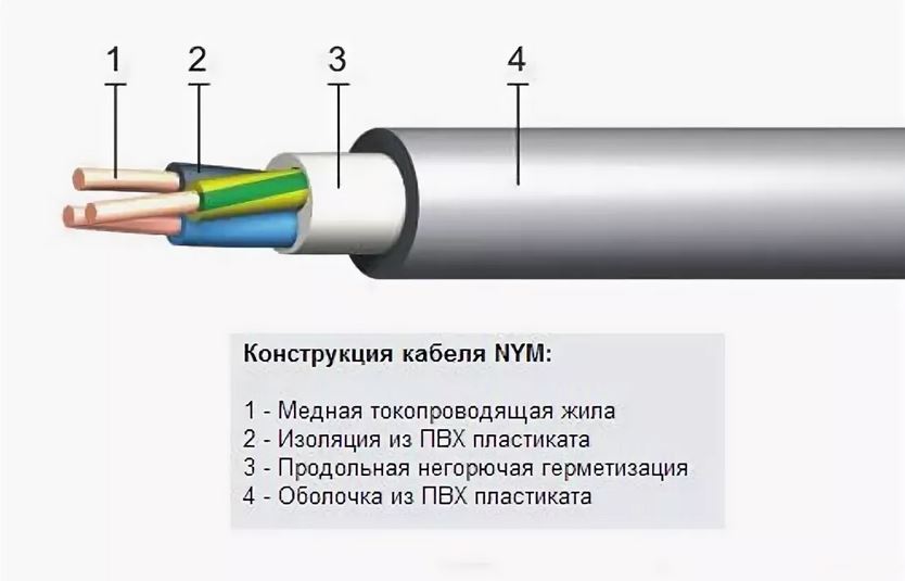 Жилы выполнены из меди и имеют тройную изоляцию. Кроме двух слоев изоляции из ПВХ, в кабеле присутствует промежуточный слой негорючего наполнителя, который поглощает напряжение между наружной изоляцией и жилами.