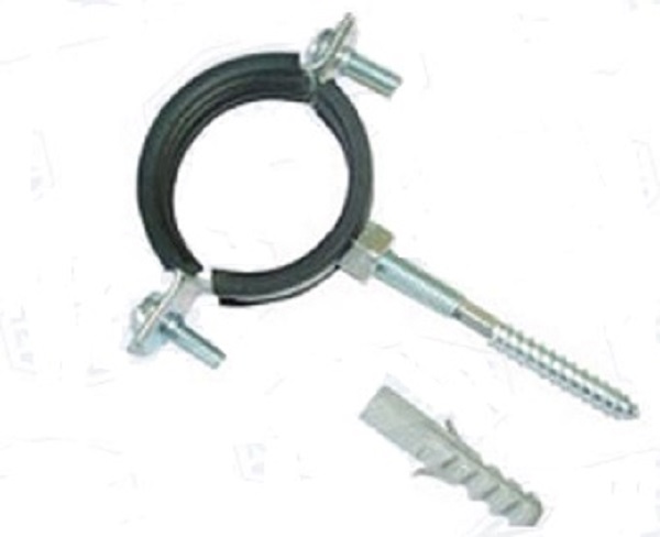 Состав: хомут с шурупом, уплотнитель – резина, дюбель.