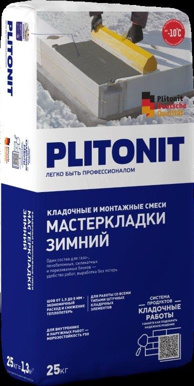 Кладочная смесь Плитонит Мастер кладки зимний 25кг - сухая цементная смесь для укладки блоков из ячеистого бетона, газобетона, пенобетона. Смесь может быть использована в качестве клея для для силикатных и поризованных керамических блоков при производстве внутренних и наружных работ. Так же может использоваться в качестве ремонтного состава для выравнивания сколов и выбоин на поверхности ячеистого бетона.