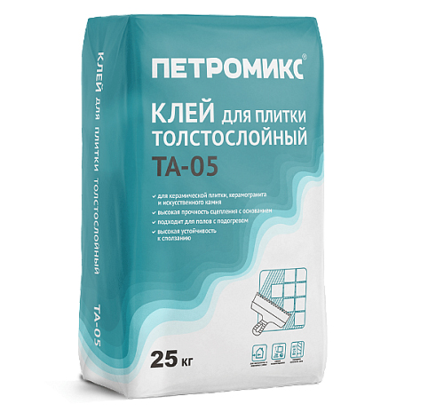 Клей для плитки Петромикс ТА-05 (К) - толстослойная клеевая строительная смесь для проведения внутренних и наружных работ.